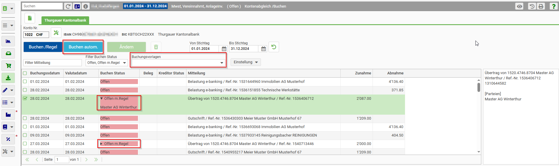 Die Regel wird nun auf alle Transaktionen mit der gleichen Bankinformation angewendet und im Buchen Status mit Offen m. Regel gekennzeichnet.