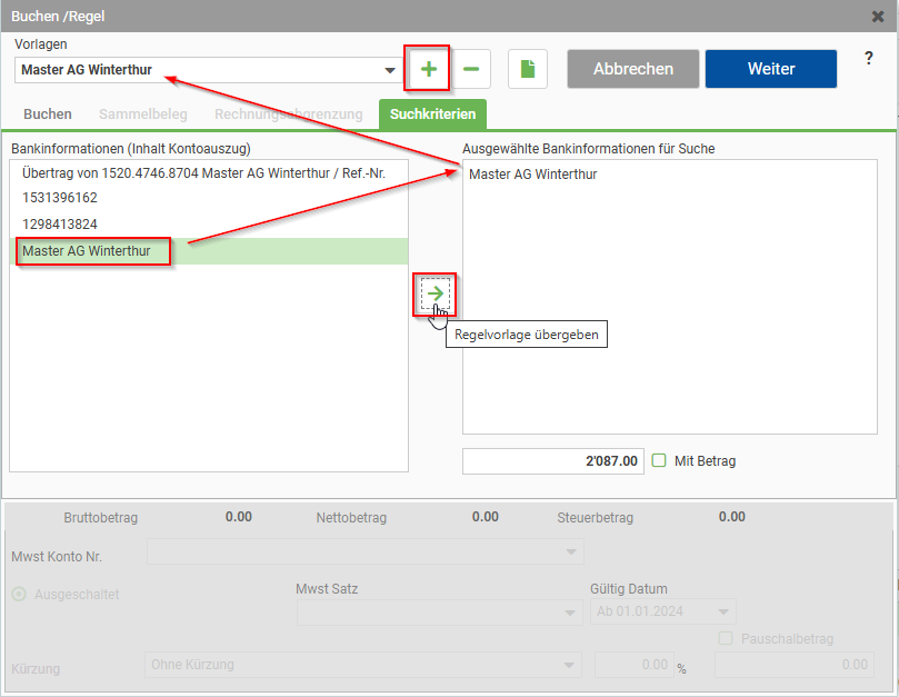 Wählen Sie nun aus den Bankinformationen die wiederkehrenden Inhälte aus, auf welche die Regel angewendet werden soll. Die ausgewählten Inhälte sind auf der rechten Seite ersichtlich und können bearbeitet werden. Anhand der ausgewählten Bankinformationen wird automatisch ein Vorlagenname erstellt. Speichern Sie nun die erfasste Regel mit dem Plus und im Anschluss die Buchung mit Verbuchen.