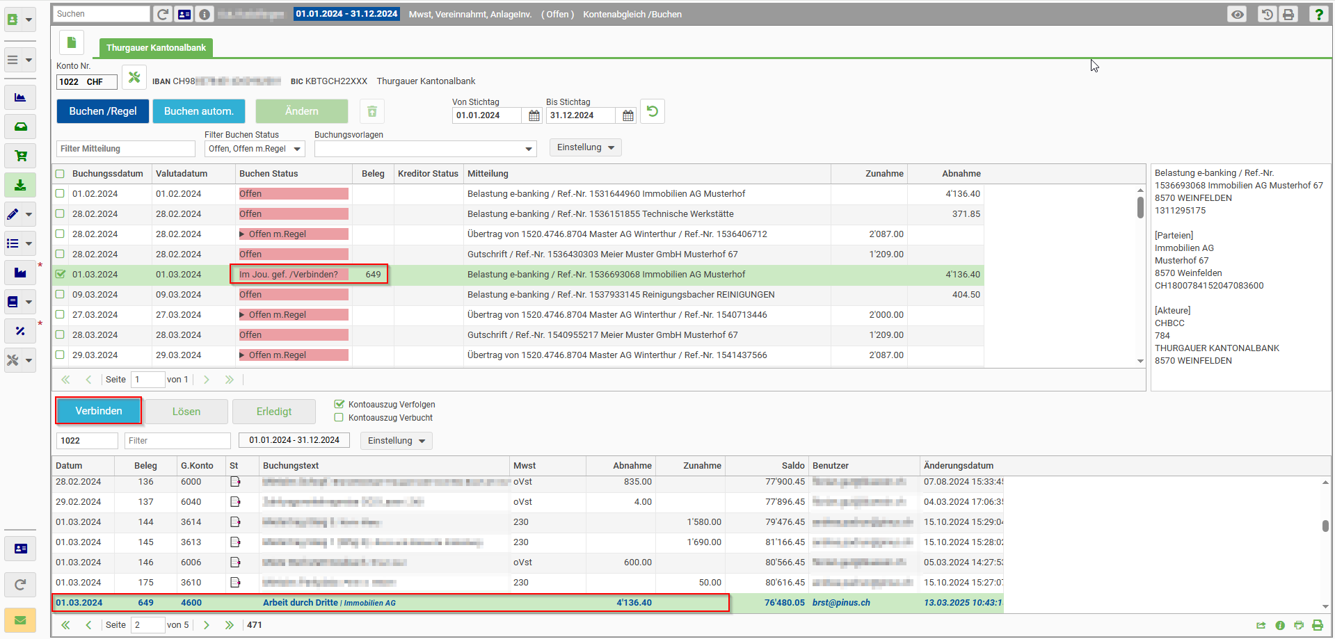 Durch markieren der Transaktion, wird im Journal unten die Buchung angezeigt. Über den Button Verbinden, können die Datensätze miteinander verknüpft werden und die Transaktion wird ohne Buchen als erledigt markiert.