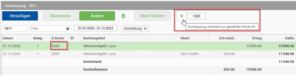 Im unteren Bereich der Konteneinsicht bei den Buchungen haben Sie die Möglichkeit zum Gegenkonto einer markierten Buchung zu wechseln.