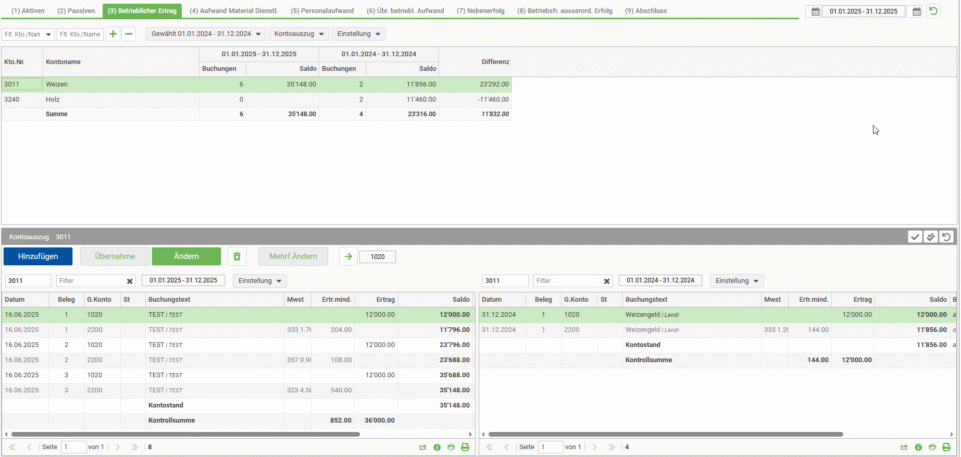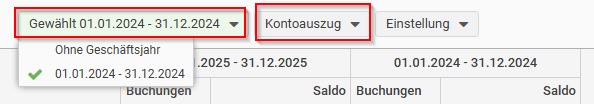 Optional können Sie ebenfalls den Kontoauszug des gewählten Vergleichsjahres aktivieren. So erhalten Sie Einblick sowohl in die Kontensaldi als auch auf die Buchungen im Konto.