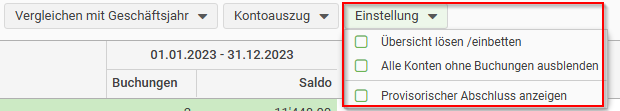 Alle Konten ohne Buchungen ausblenden – Mit dieser Einstellung werden sämtliche Konten nicht angezeigt, die keine Buchung ausweisen. Diese Einstellung dient der Übersichtlichkeit.