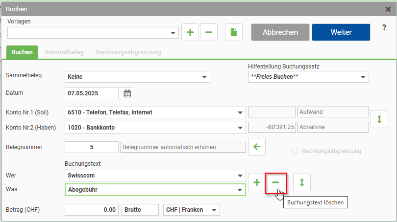 Falls der gespeicherte Text gelöscht werden soll, rufen Sie in in der Buchungsmaske auf und klicken Sie auf das Minus-Symbol um den Text zu löschen.