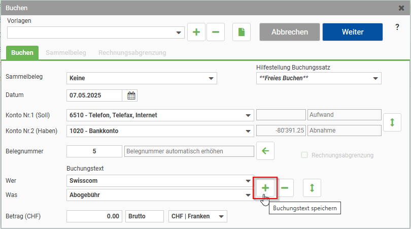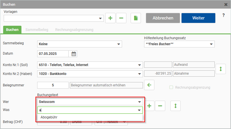 Erfassen Sie in einem ersten Schritt den gewünschten Text in den Wer- und Was-Felder der Buchungsmaske und definieren Sie die Soll- und Haben-Konti.