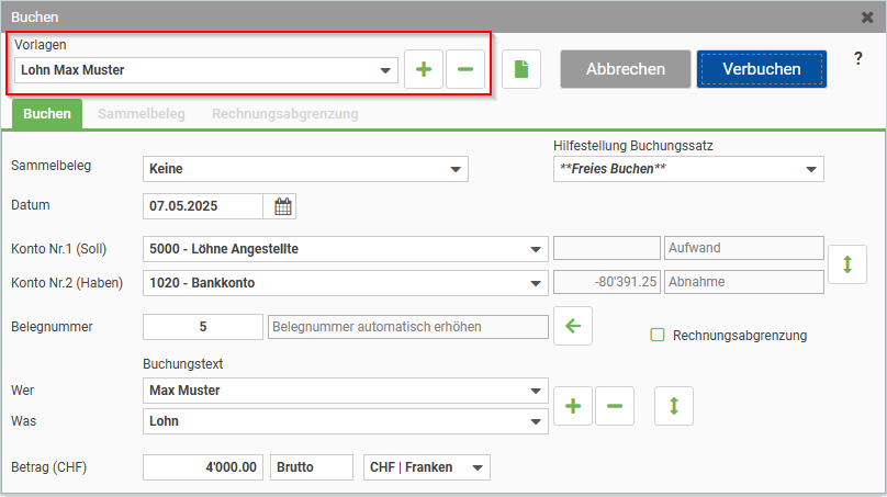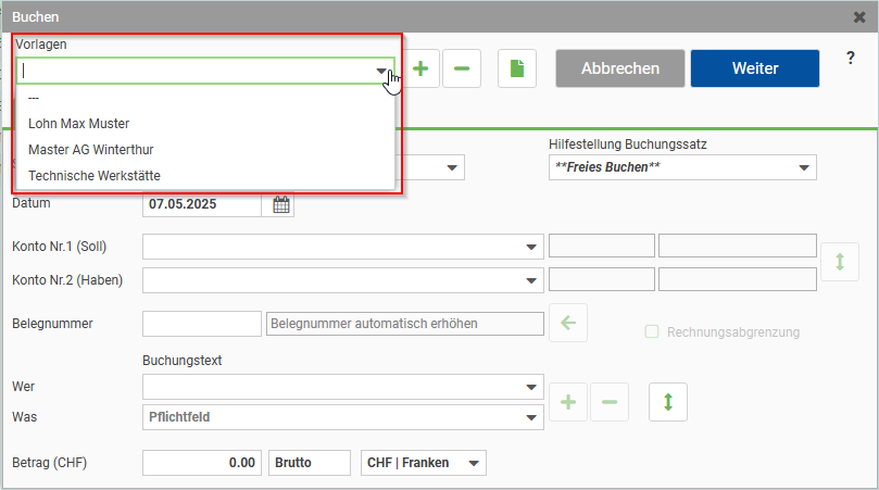 Die erfassten Vorlagen wählen Sie über das Drop-Down Menü aus. Durch die Auswahl wird Ihnen die Buchungsmaske komplett befüllt. Sie haben nun die Möglichkeit die Buchung zu ergänzen oder zu korrigieren bevor Sie diese verbuchen.